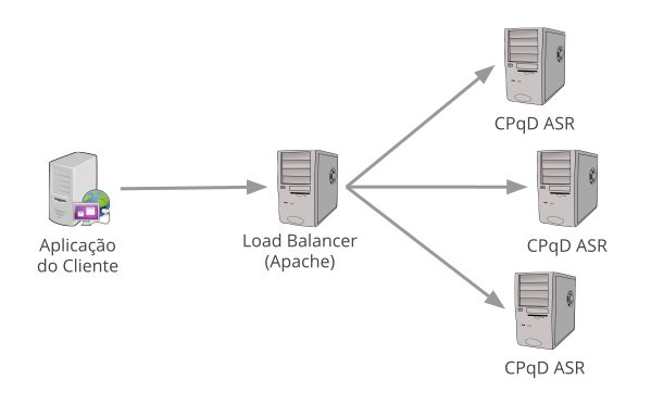 This guide presents a very simple topology to create a Speech Recognition cluster, using Apache HTTP Server as a load balancer. The figure below illustrates this topology. This is merely an example and can be altered, using more complex balancing schemes to provide high availability, eliminating failure (single point of failure).